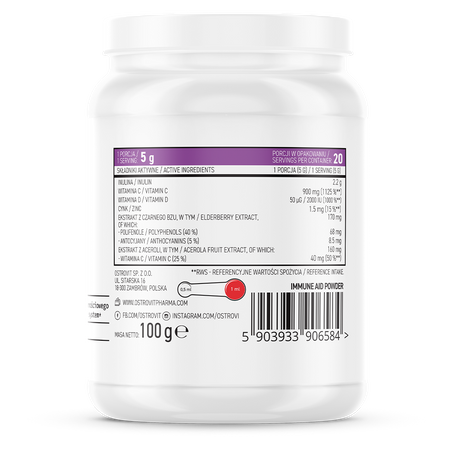 OstroVit Pharma Immune Aid sisältää kuusi immuunijärjestelmää tukevaa ainesosaa – C-vitamiinia, D3-vitamiinia, sinkkiä, inuliinia, mustikkauutetta ja karotenoidiuutetta – kätevänä vadelmanmakuisena jauheena. Inuliini toimii prebioottina, joka ravinnolla tukee suolistobakteereja. Saatavilla Omegafit.ee-verkkokaupasta Pärnusta, Virosta.
