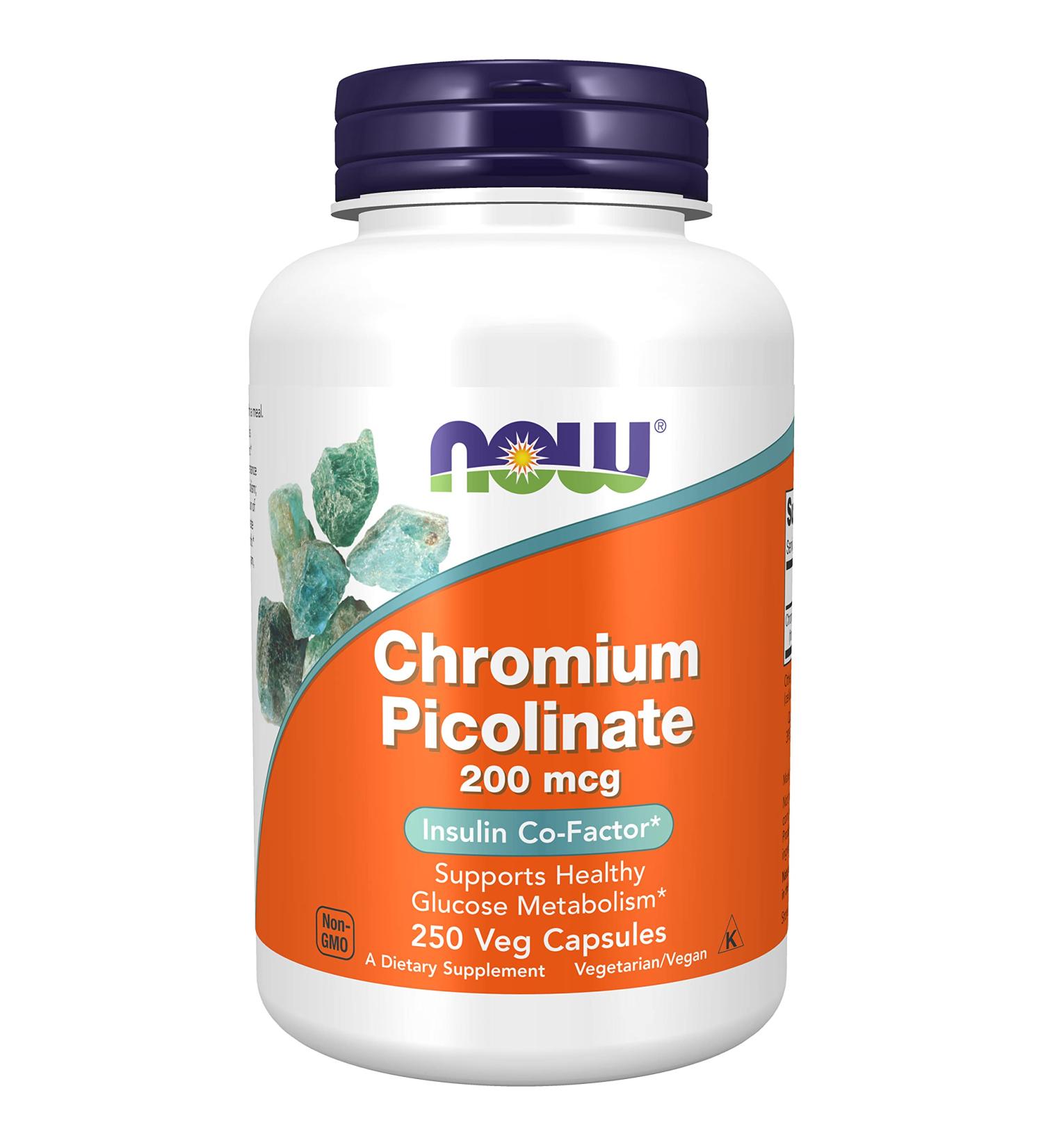 NOW Kromipikolinaatti 200 mcg tukee insuliinin toimintaa ja tervettä glukoosiaineenvaihduntaa 100 kasviskapselissa.