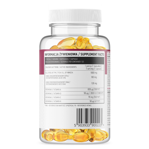 Täydellinen ratkaisu päivittäiseen terveyteen — OstroVit Omega 3 + ADEK yhdistää omega-3-rasvahapot ja rasvaliukoiset vitamiinit (A, D, E, K) yhdessä kapselissa. EPA (180 mg) ja DHA (120 mg) ovat välttämättömiä rasvahappoja sydämen ja aivojen tukemiseksi, kun taas rasvaliukoiset vitamiinit tarvitsevat rasvahappoja varmistaakseen optimaalisen imeytymisen. Saatavilla Omegafit.ee-verkkokaupasta Pärnusta, Virosta, toimitus 1-2 päivässä Suomeen, Viroon, Latviaan ja Liettuaan.