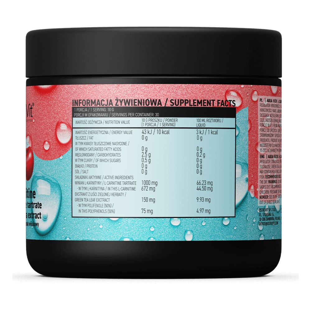 OstroVit Aqua Kick L-Carnitine 300g on kahden rasvakudoksen polttamista tukevan ainesosan yhdistelmä: L-karnitiinitartraatti ja 50 % polyfenoleilla standardoitu vihreän teen lehtiuute. Tämän ravintolisän erinomainen kirsikkamaku voi helposti korvata sokeripitoiset juomat.
