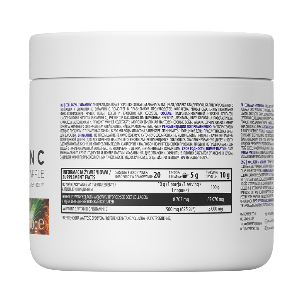 OstroVit Collagen + Vitamin C 200 g on jauhemainen ravintolisä, joka sisältää hydrolysoitua lampaanluukollageenia ja C-vitamiinia. Se tukee ihon elastisuutta, nivelten terveyttä ja yleistä hyvinvointia, ja se on saatavilla useissa eri mauissa. Saatavilla Omegafit.ee-verkkokaupasta Pärnusta, Virosta, toimitus 1-2 päivässä Suomeen, Viroon, Latviaan ja Liettuaan.