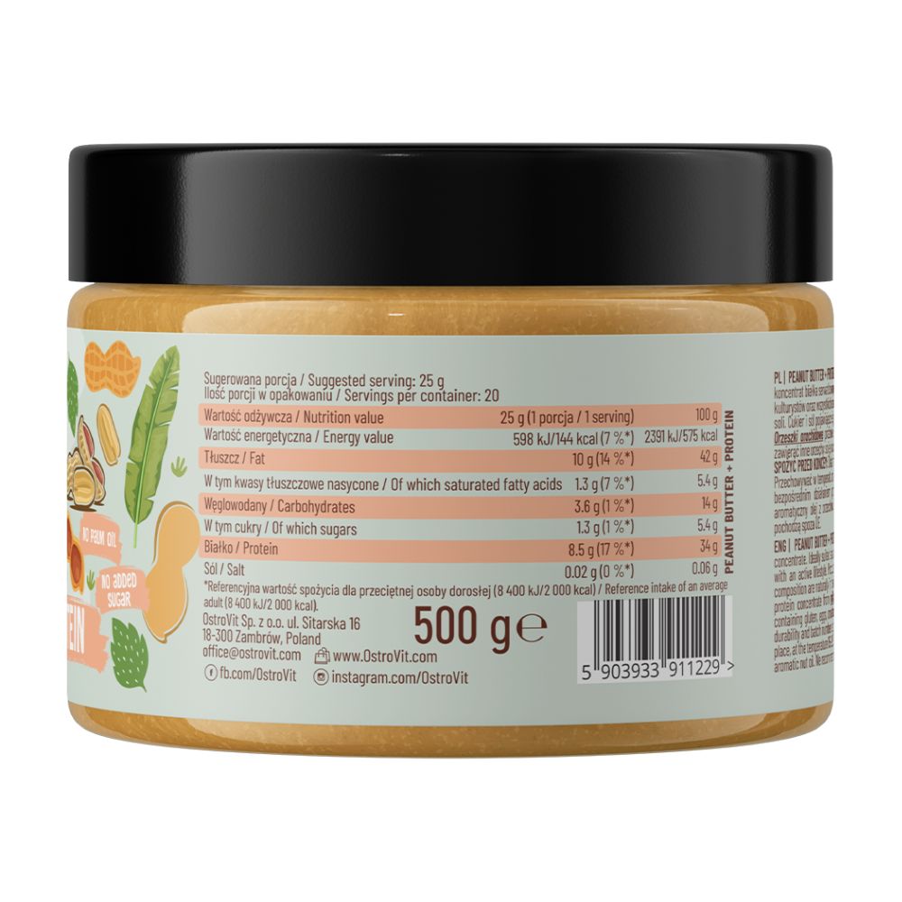 Maapähkinävoi sisältää runsaasti terveellisiä tyydyttymättömiä rasvahappoja. OstroVit Peanut Butter with added protein 500g ravintoprofiilille on ominaista kohonnut proteiinipitoisuus (heraproteiinin lisäyksen ansiosta), korkea kuitupitoisuus ja hiilihydraatit pääasiassa kompleksisessa muodossa. Tämä pähkinävoi on erinomainen energianlähde (tarjoten samalla pitkäkestoista kylläisyyden tunnetta) ja välttämättömiä ravintoaineita. 2–3 teelusikallista maapähkinävoita päivässä on loistava lisä niille, jotka kiinnittävät huomiota ravintoon.