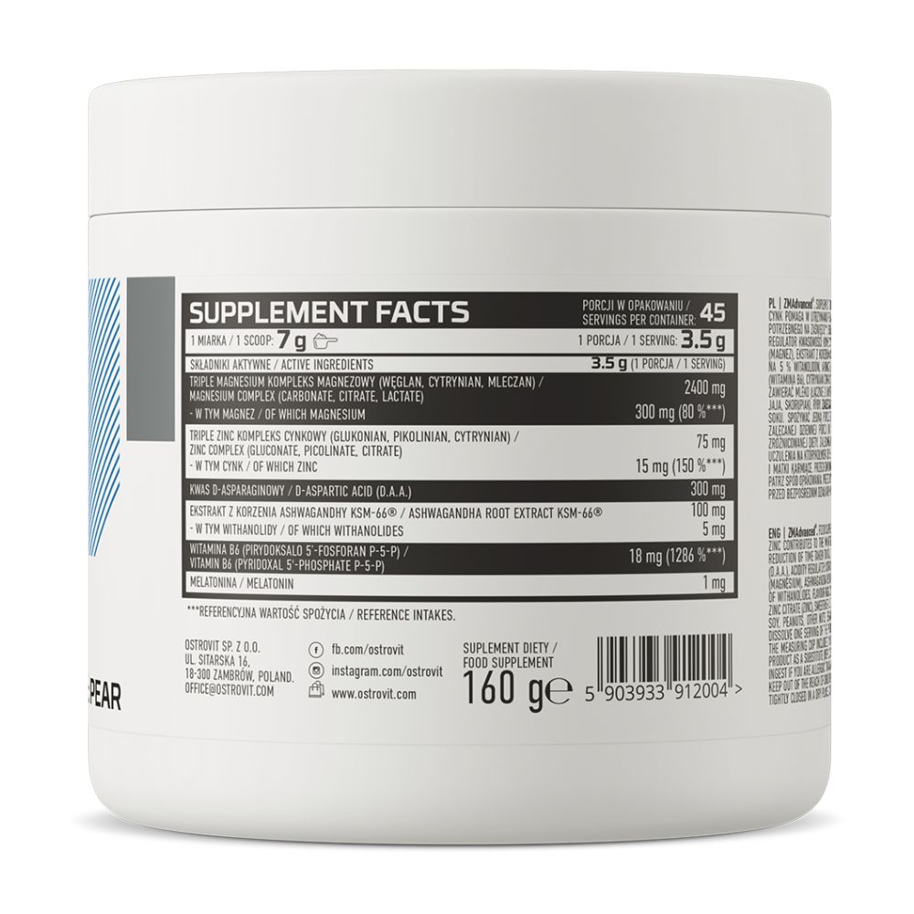 OstroVit ZMAdvanced 160 g Apple-Pear on korkealaatuinen jauhemainen ravintolisä, jossa on raikas omenan ja päärynän maku. Koostumus koostuu jopa kuuden aktiivisen ainesosan kompleksista – sinkki- ja magnesiumkompleksista, johon on yhdistetty D-aspartiinihappoa, Ashwagandha-juuriuutetta, melatoniinia ja B6-vitamiinia. Se on kehitetty korkealaatuisista ainesosista kaikille fyysisesti aktiivisille henkilöille, jotka välittävät asianmukaisesta päivittäisestä palautumisesta ja lepoprosessista.