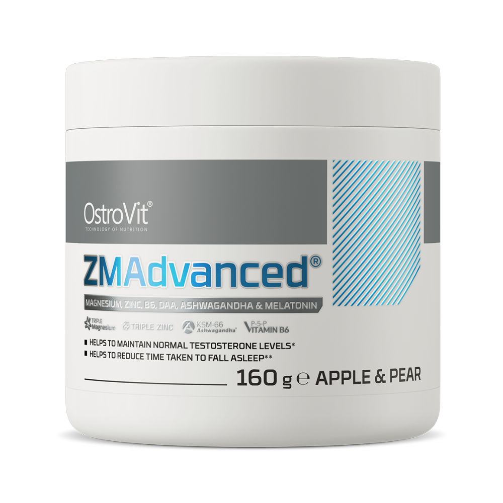 OstroVit ZMAdvanced 160 g omenan ja päärynän makuinen jauhe sisältää sinkkiä, magnesiumia, ashwagandhaa, melatoniinia ja B6-vitamiinikompleksia. Tukee palautumista treenin jälkeen ja laadukasta unta, 45 annosta per pakkaus. Saatavilla Omegafit.ee-verkkokaupasta Pärnusta, Virosta, toimitus 1-2 päivässä Suomeen, Viroon, Latviaan ja Liettuaan.